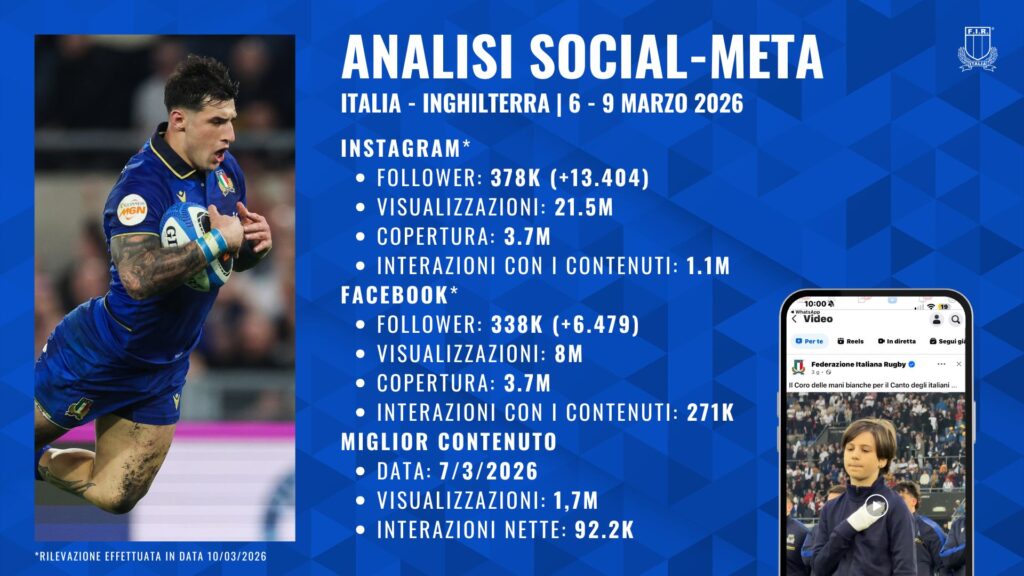Il 23-18 maturato sabato 7 marzo, grazie alle mete di Tommaso Menoncello e Leonardo Marin e ai punti al piede di Paolo Garbisi, ha portato con sé risultati rilevanti anche sul fronte della copertura media e social di un evento — il Sei Nazioni — che di anno in anno si consolida come un appuntamento ormai tradizionale dell’inizio dell’anno sportivo e che, complice la vittoria degli Azzurri, ha registrato una crescita significativa in termini di esposizione.