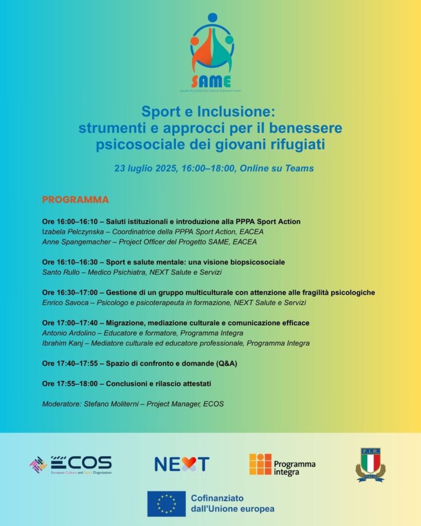 Nell’ambito del Progetto Erasmus+ Sport SAME – Sports Activities for Mental Enhancement’ di cui FIR è partner, il 23 luglio 2025 dalle ore 16:00 alle ore 18:00 avrà luogo online su Microsoft Teams un workshop gratuito, destinato a Tecnici sportivi (allenatori, coach, istruttori), operatori sociali e club, dedicato all’uso dello sport come strumento per il benessere mentale e l’inclusione sociale dei giovani rifugiati.